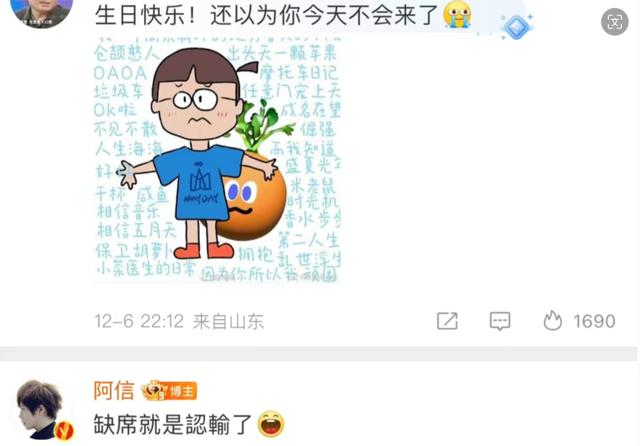 12月6日還是阿信48歲的生日,有粉絲留言說:“生日快樂!還以為你今天不會來了”。阿信顯得底氣十足的回應說:“缺席就是認輸了”。
