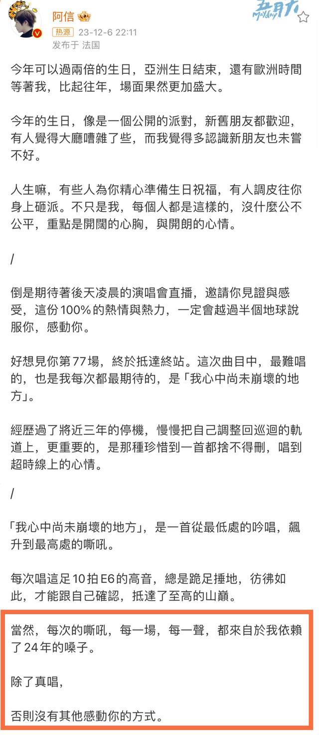但這篇回應并不足以服眾。在“小作文”中,阿信提到了《我心中尚未崩壞的地方》這首歌,他表示,“每次唱足這10拍E6的高音,總是跪足捶地,仿佛如此,才能跟自己確認,抵達了至高的山巔”。
